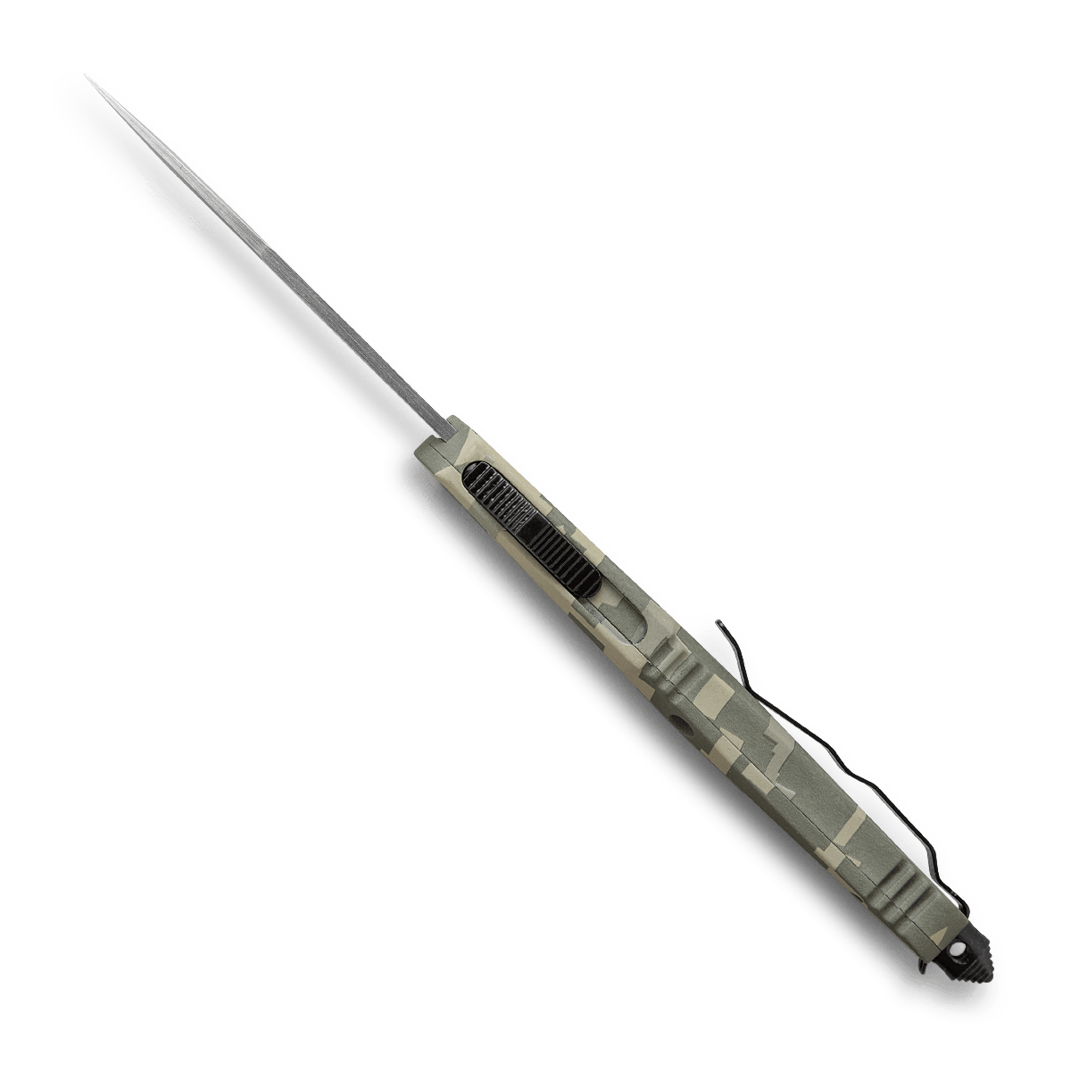 Den fullvuxna versionen av den populära FS-3 imponerar med ett solitt D2 drop point-blad som skjuts ut ur framhandtaget lika snabbt som en pil vid knapptryckning och försvinner tillbaka när knappen trycks igen. Denna OTF (Out The Front) kniv har ett texturerat handtag av högstyrke-aluminium i ett grönt kamouflagemönster. Deep carry clip är fäst vid glaskrossen och möjliggör tip-up bärande på båda sidor. Levereras med ett högkvalitativt nylonfodral.