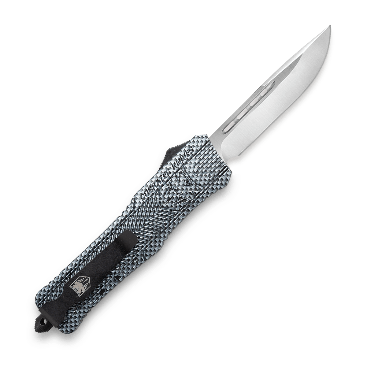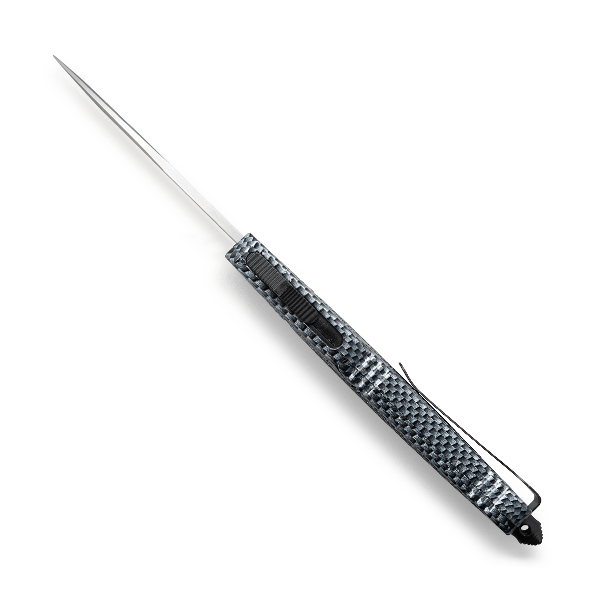 Den fullvuxna versionen av den populära CTK-1 imponerar med ett robust D2 drop point-blad som skjuts ut ur fronthandtaget lika snabbt som en pil med ett knapptryck och försvinner tillbaka när knappen trycks igen. Denna OTF (Out The Front) kniv har ett texturerat handtag tillverkat av högstyrke-aluminium med ett modernt kolfibermönster. Deep carry clip är fäst vid glaskrossen och möjliggör tip-up bärande på båda sidor. Levereras med ett högkvalitativt nylonfodral.