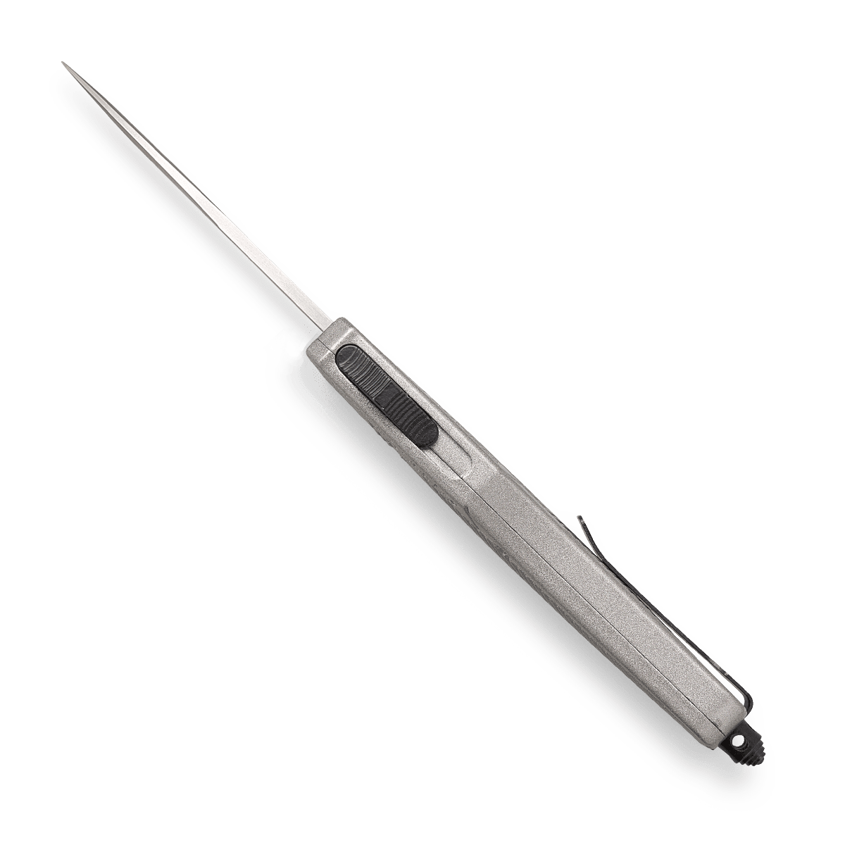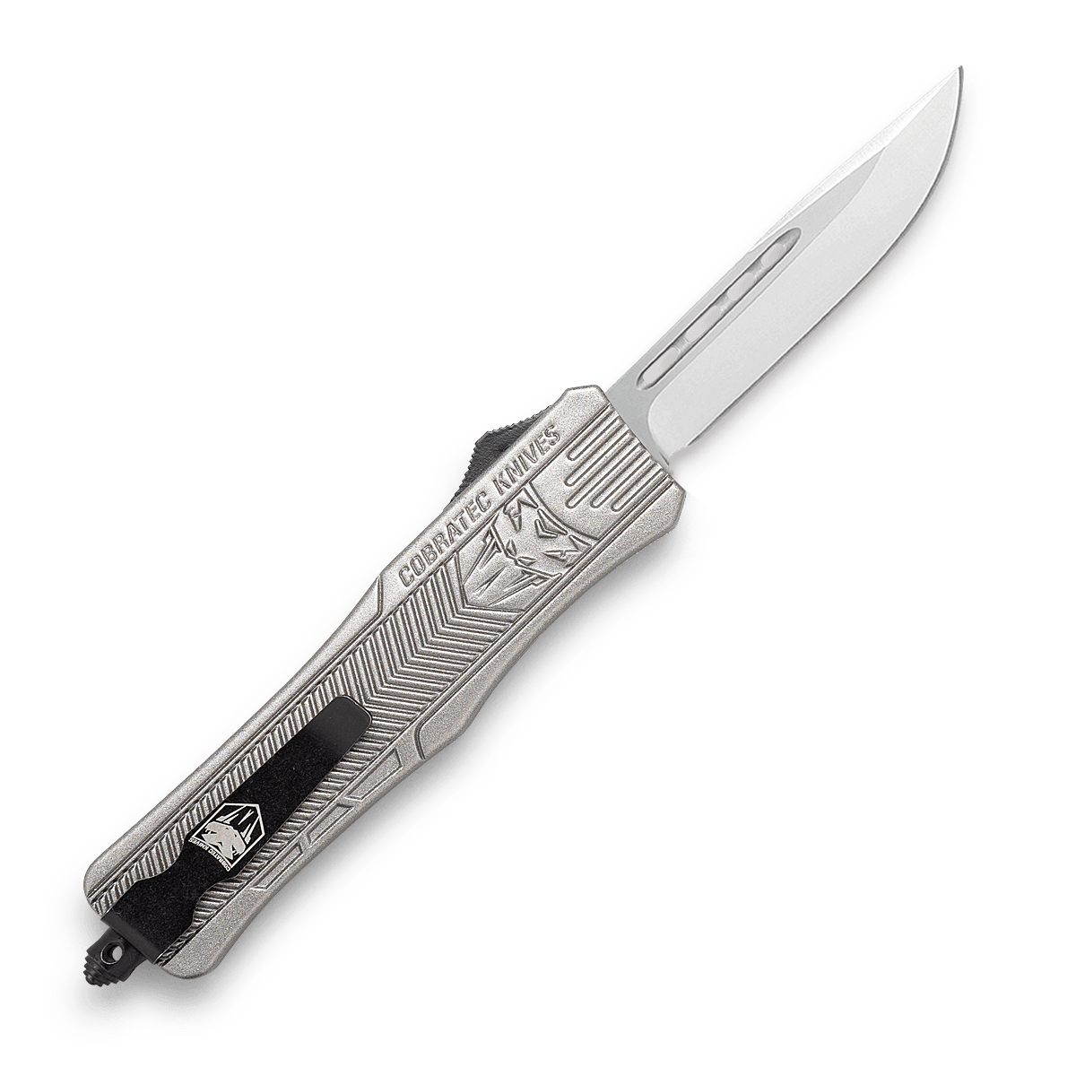 Den medelstora versionen av den populära CTK-1 imponerar med ett robust drop point-blad i D2-stål, som skjuts ut från fronthandtaget med en knapptryckning och försvinner igen när knappen trycks in på nytt. Denna OTF (Out The Front) kniv har ett texturerat handtag tillverkat av högstyrkealuminium och har en industriell silverfinish. Deep carry clip är fäst vid glaskrossen och möjliggör tip-up bärande på båda sidor. Levereras med ett högkvalitativt nylonfodral.