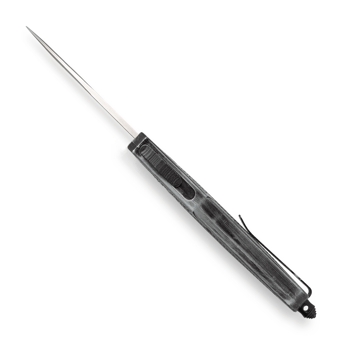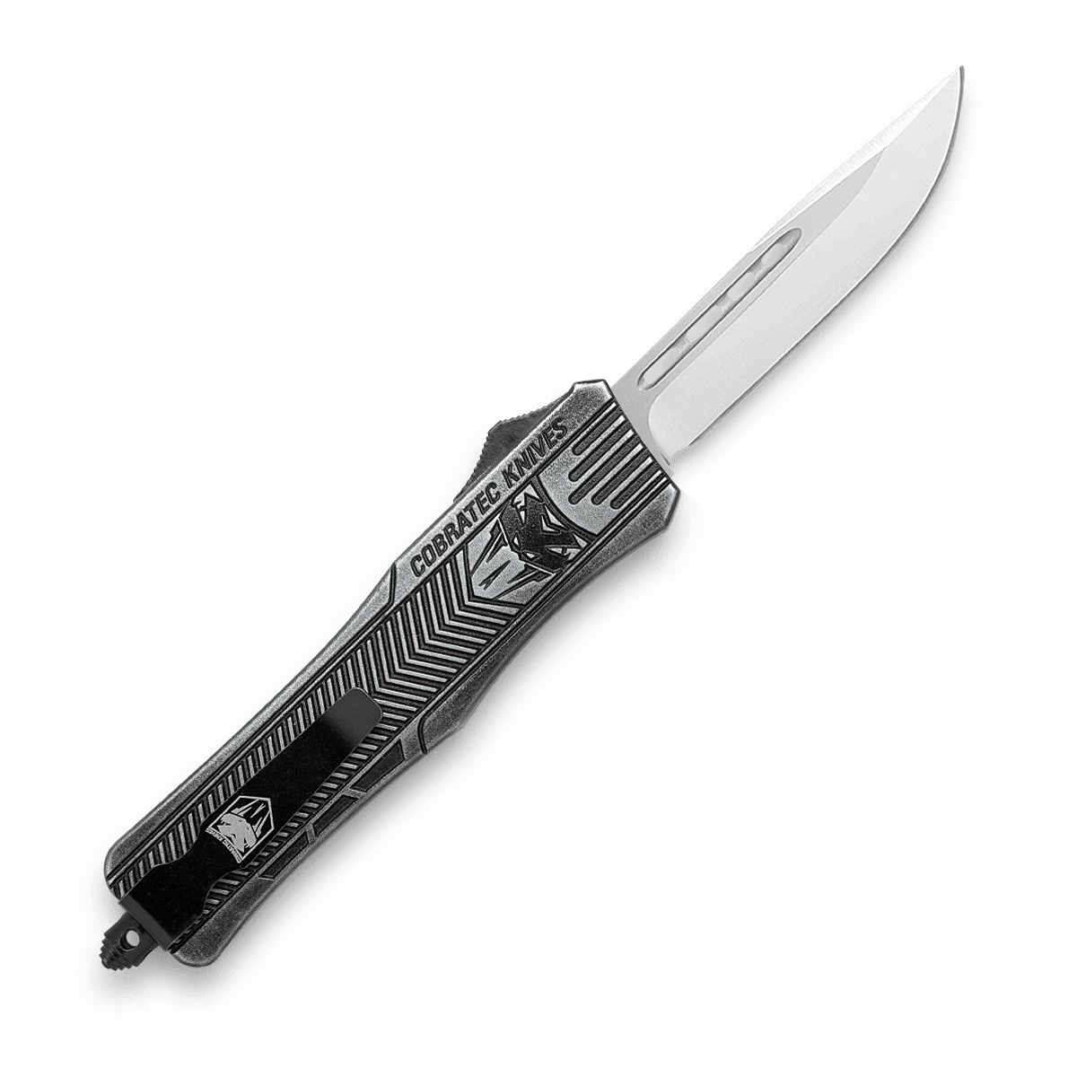 Den medelstora versionen av den populära CTK-1 imponerar med ett robust D2 drop point-blad, som skjuts ut från framsidan av handtaget med en knapptryckning och försvinner igen när knappen trycks in på nytt. Denna OTF (Out The Front) kniv har ett texturerat handtag av högstyrkealuminium med en rustik stonewash-finish. Deep carry clip är fäst vid glaskrossen och möjliggör tip-up bärande på båda sidor. Levereras med ett högkvalitativt nylonfodral.