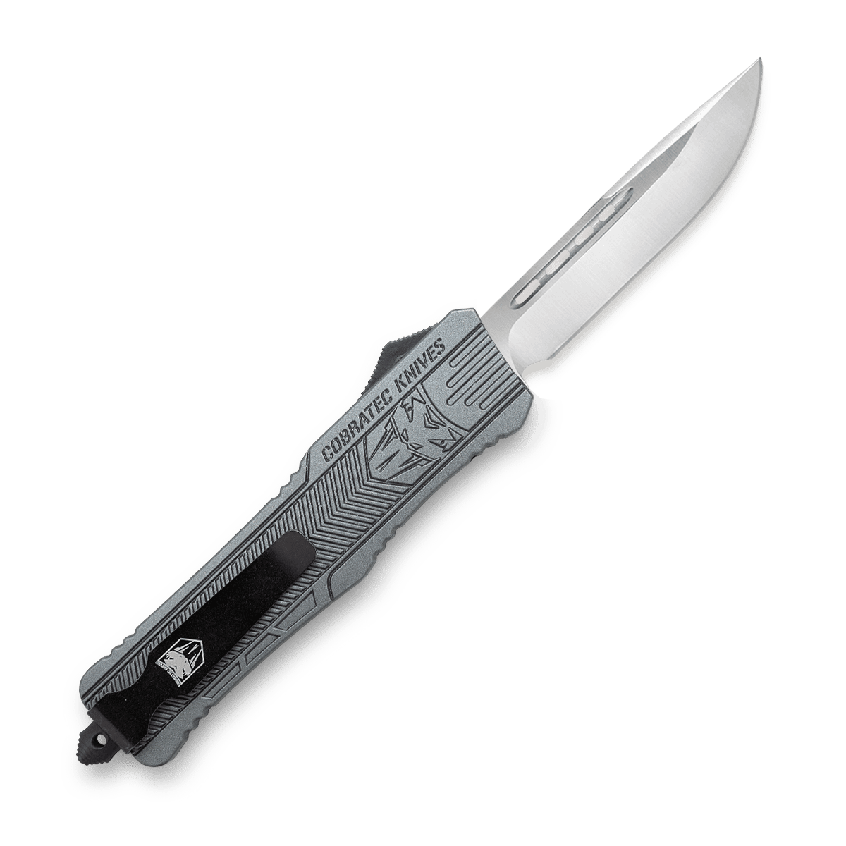 Den fullvuxna versionen av den populära CTK-1 imponerar med ett robust D2 drop point-blad som skjuts ut från fronthandtaget lika snabbt som en pil med en knapptryckning och försvinner tillbaka när knappen trycks igen. Denna OTF (Out The Front) kniv har ett texturerat handtag av högstyrke-aluminium och är färdigställd i en industriell grå nyans. Deep carry clip är fäst vid glaskrossen och möjliggör tip-up bärande på båda sidor. Levereras med ett högkvalitativt nylonfodral.