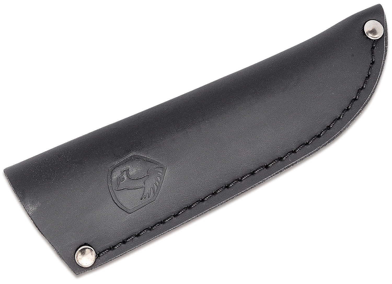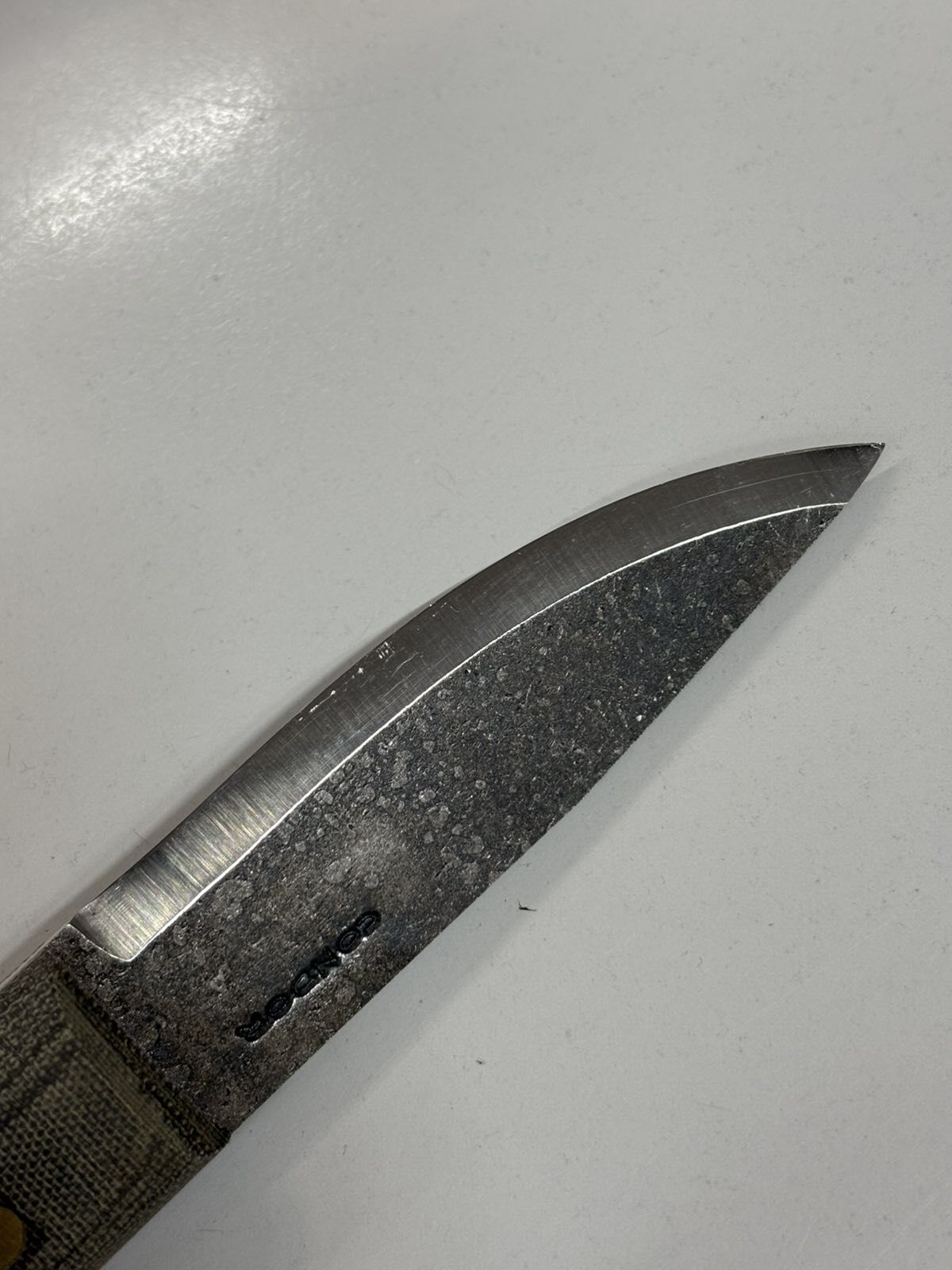 Den har ett fast blad med slät egg tillverkat av kolstål 1075 med naturlig ytbehandling och scandi grind. Den är benägen att rosta. Regelbundet underhåll kan enkelt förhindra detta.