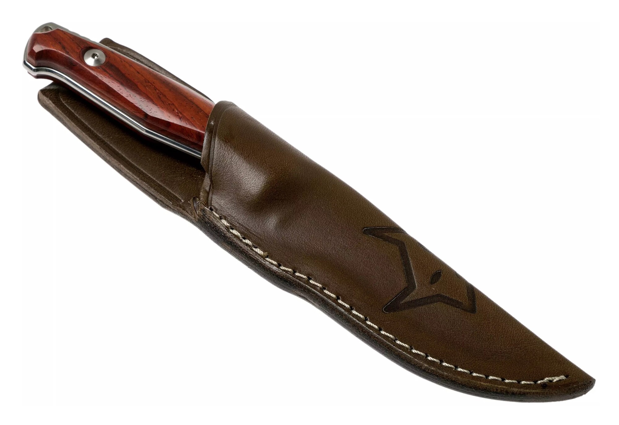 Bladet med fulltang-konstruktion är tillverkat av premium rostfritt stål N690Co. Det formade handtaget är gjort av exotiskt cocoboloträ. I slutet av handtaget finns ett hål för snodd.