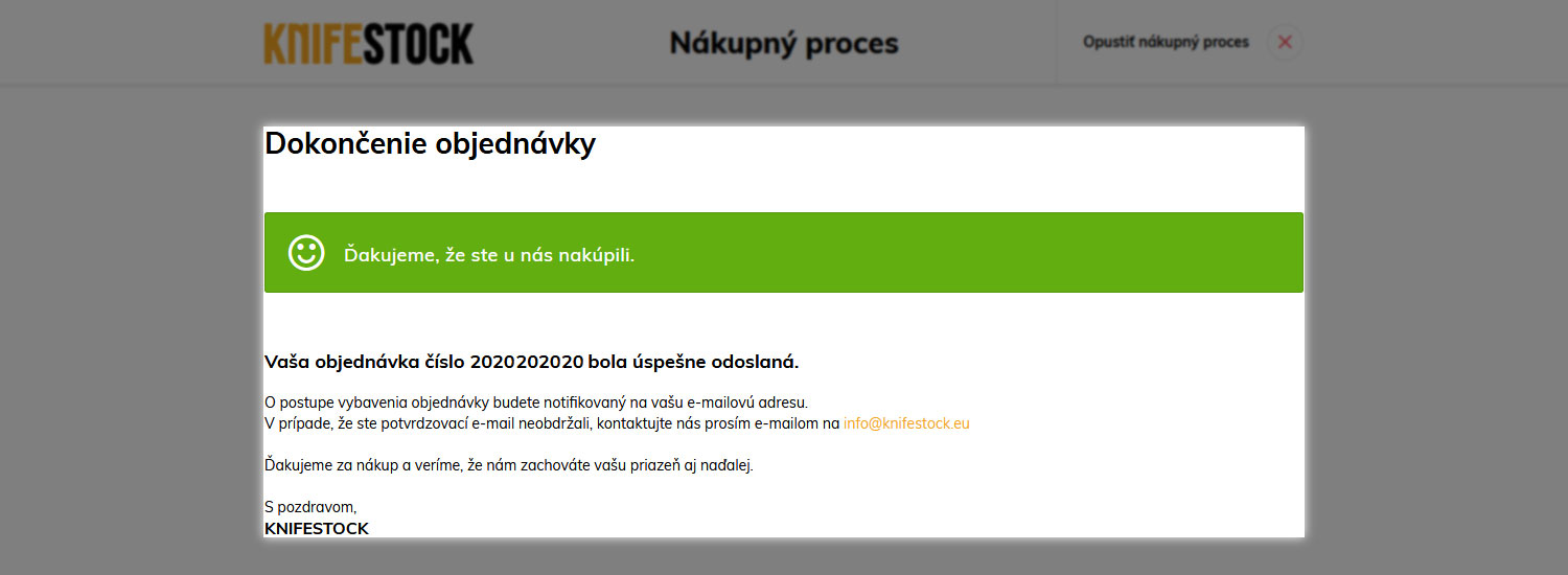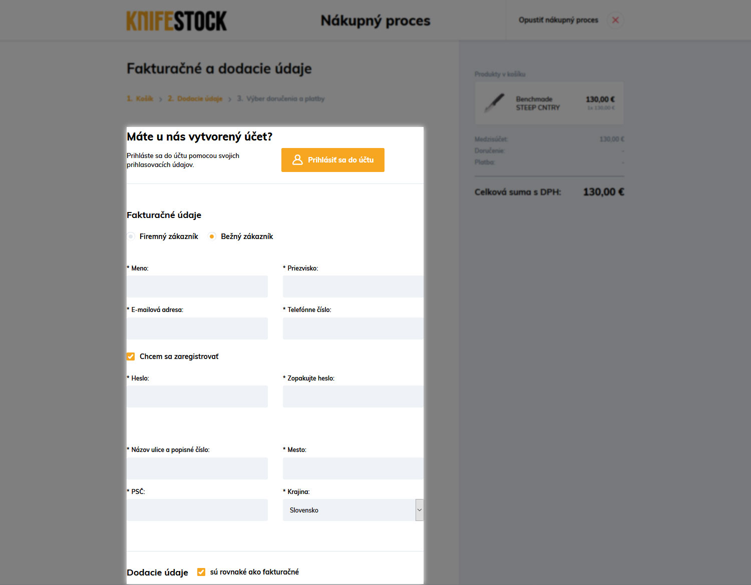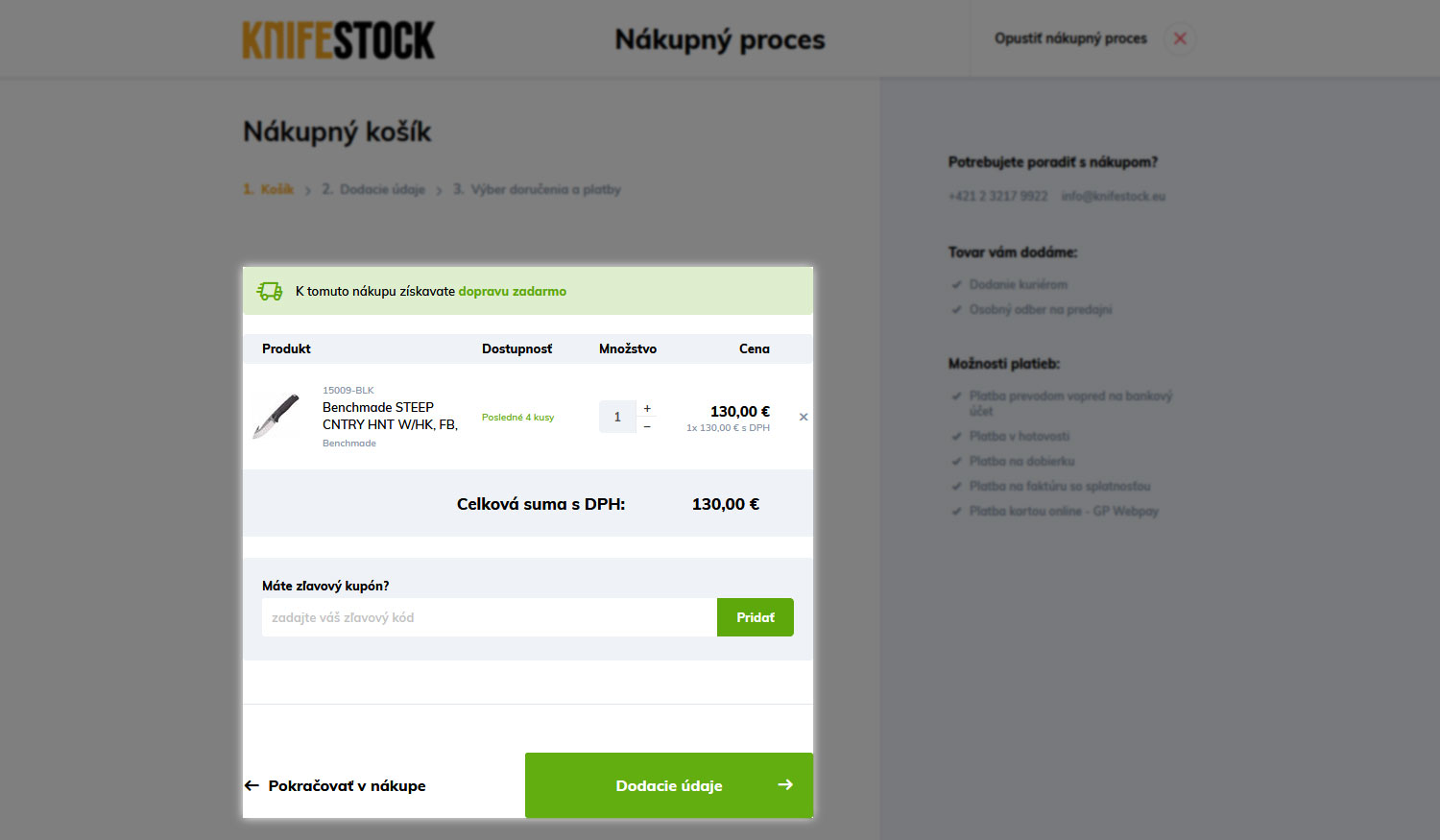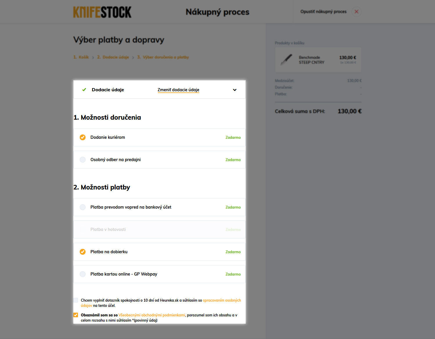 - Nästa steg är "LEVERANS OCH BETALNING" där du väljer leveranssätt och betalningssätt. Efter att ha valt de önskade metoderna, är det nödvändigt att bekanta sig med de allmänna villkoren för webbutiken https://www.knifestock.sk/ och kryssa i samtycke.