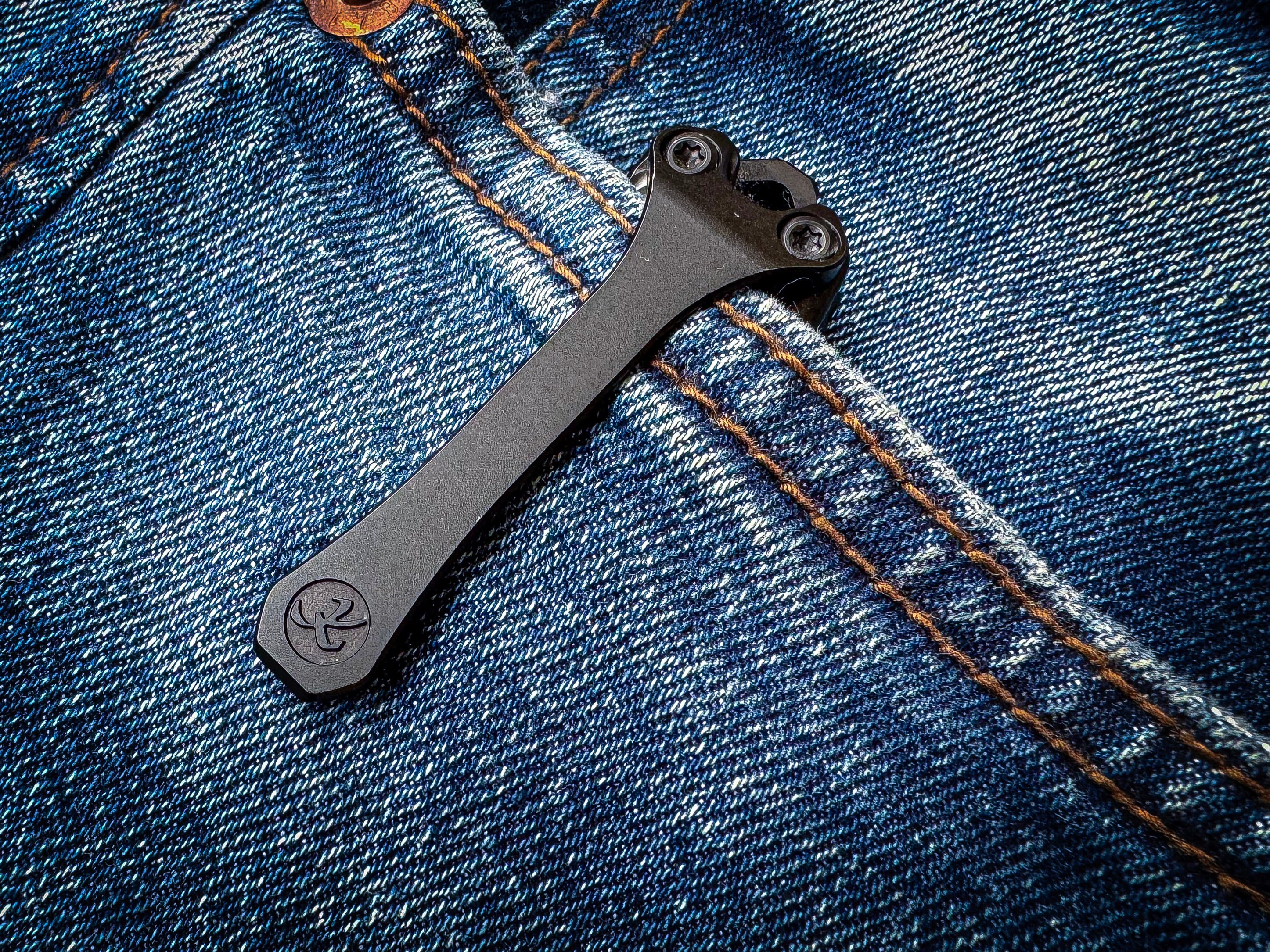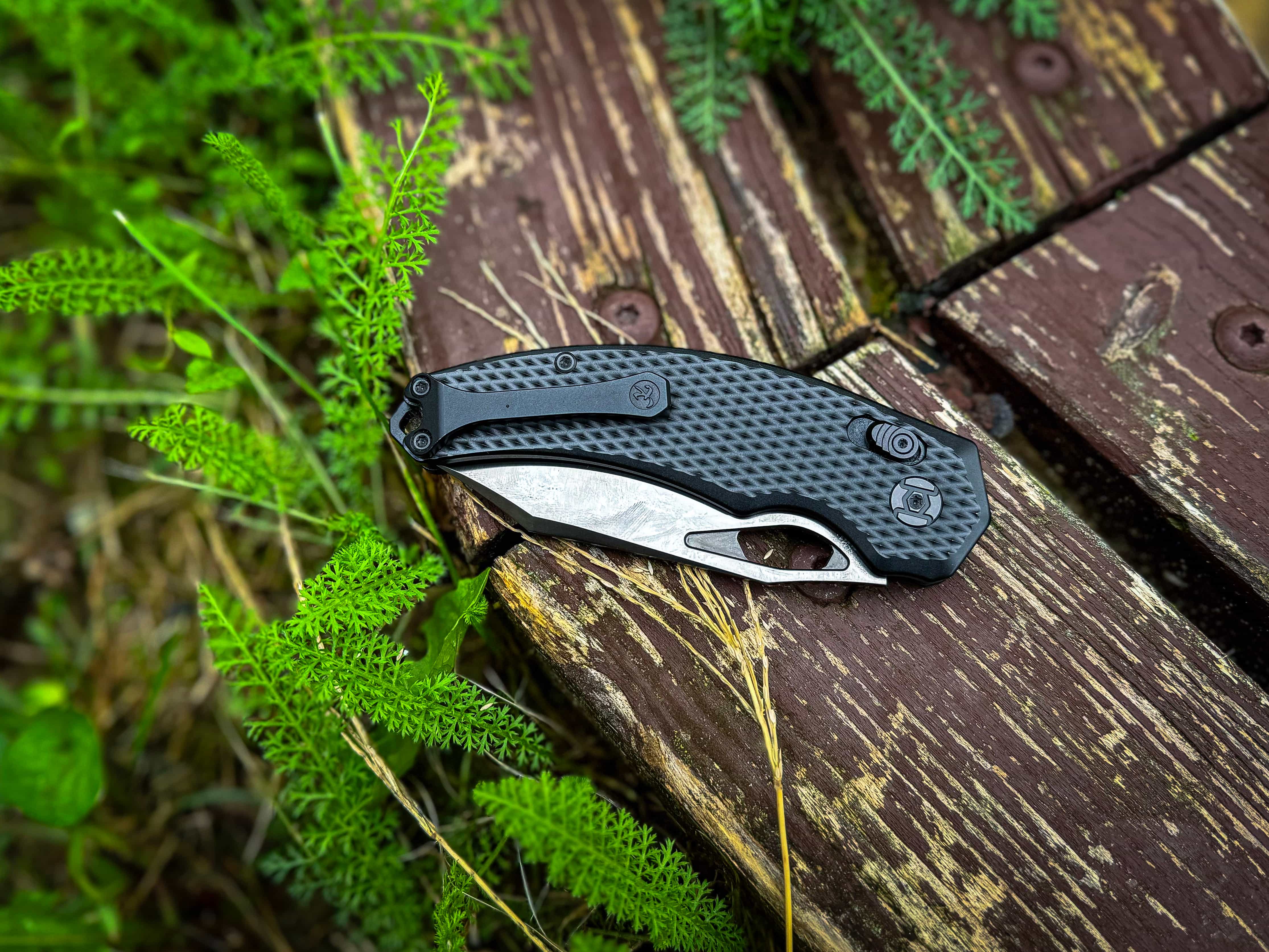 En annan framträdande egenskap hos denna kniv är titanklippet och backspacern, naturligtvis i svart! Det robusta titanklippet säkerställer att kniven kan bäras säkert och diskret i fickan, samtidigt som den bibehåller stabilitet och komfort vid bärande. Backspacern ger extra styrka till handtaget, vilket förbättrar knivens totala hållbarhet och konstruktionens stabilitet.