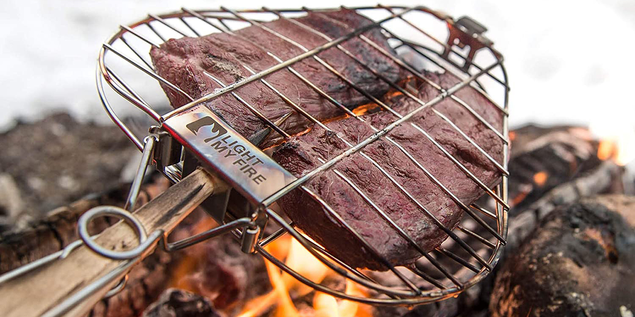 Välj en bra och rak pinne att placera, och säkra den sedan med grillens armar. Fäst den på plats, öppna den och lägg i maten som ska grillas och stäng den. Njut av en nygrillad middag över en het eld.