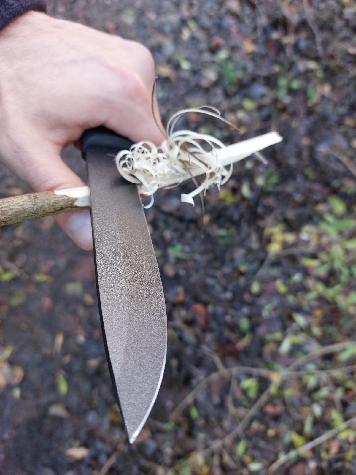 Både bladet och handtaget är väl utformade för utomhusarbete, såsom förberedelse av ved och mat, medan bladet är tjockt, robust och tillräckligt långt för battoning – klyvning av ved. Bladet är mycket vasst och skärhållningen är verkligen bra, vilket innebär att du inte behöver slipa det för ofta. Dessutom är det enkelt att slipa, som de flesta kolstål. Att skrapa spån från trä fungerar underbart och även ganska fin snidning är en barnlek, liksom att hugga ganska grovt trä. Du kan placera tummen på bladets rygg, eftersom det inte har några vassa kanter. Den höga sabelslipningen ger bladet styrka, men den övergripande geometrin fungerar också bra i lägerköket. Det är en fin blandning av styrka och skärförmåga.