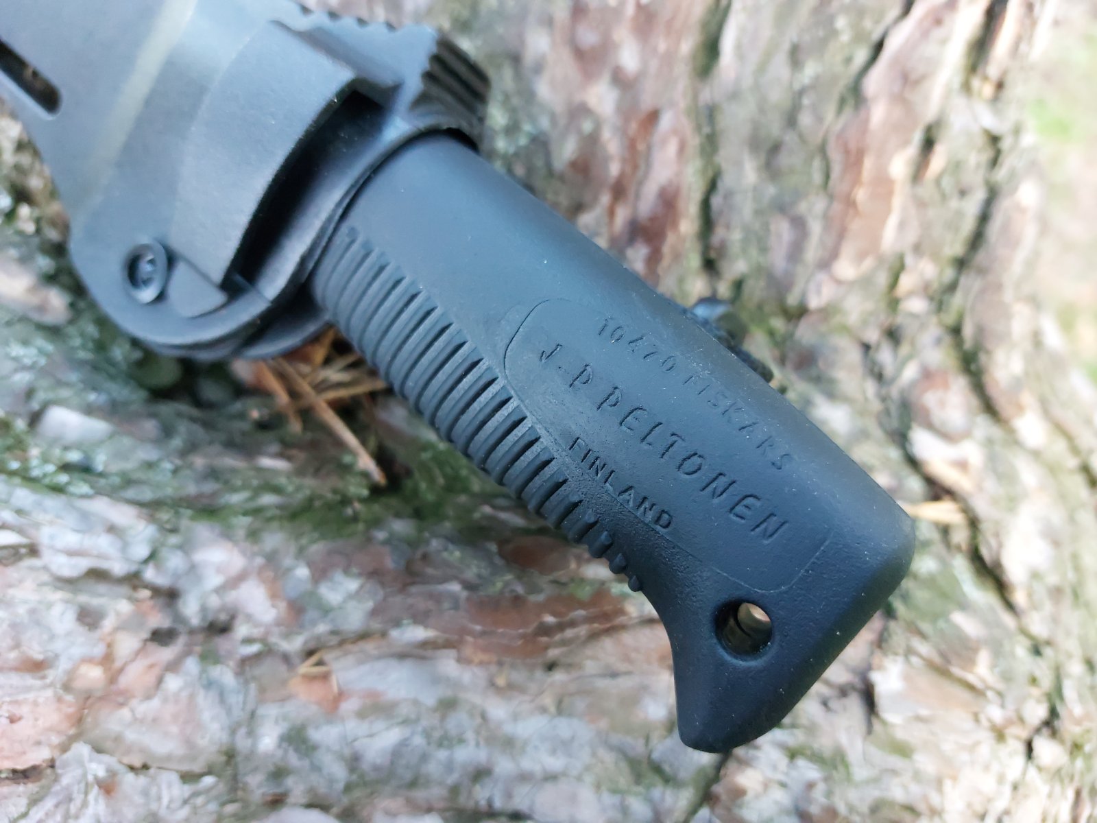 Kniven är i full-tang konstruktion, med formsprutad termoplast som ser ut och känns som gummi. Om tang var exponerad bakifrån, kunde den användas för lätt hamrande. Kpt. Peltonen nämnde att han övervägde detta och att det var hans ursprungliga avsikt, men tekniska skäl tvingade honom att ignorera det. Han leker fortfarande med tanken, men är orolig för att det skulle leda till missbruk av kniven, och han kan ha rätt i detta, med tanke på dumheten och misshandeln som vissa människor förstör sina knivar med. Poängen är att om denna kniv är tillräcklig för specialstyrkor och militären, är den mer än lämplig för civila och äventyrare över hela världen.