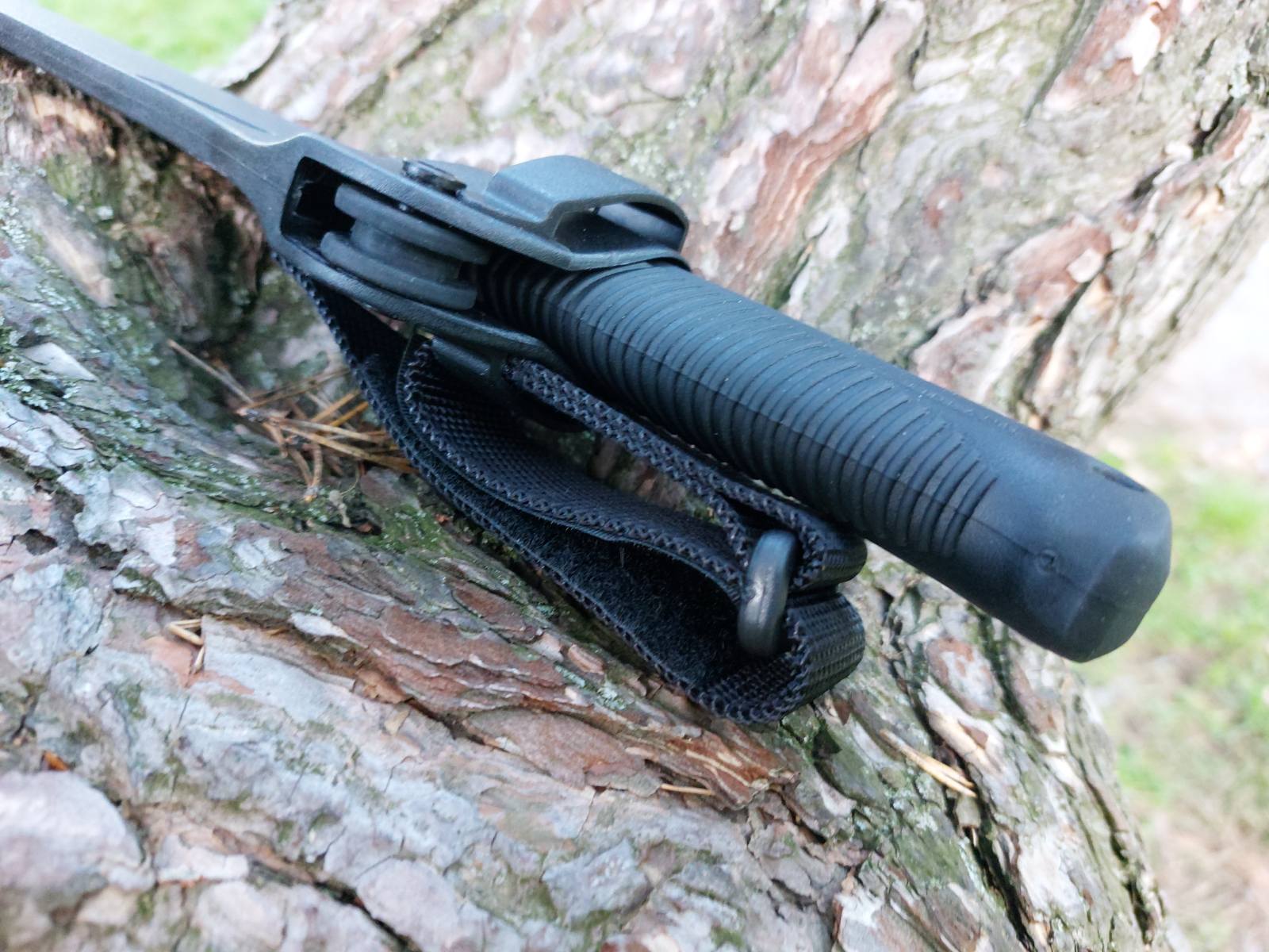 Det kommer i tre varianter, men de första två skiljer denna typ av hölster från andra på marknaden: 3 mm läder (med inre plasthölster) eller helt plast. Båda har en speciell låsning som kallas Rotating Rubber Retention, vilket i grunden är ett litet, flexibelt gummihjul inuti hölstret som håller kniven på plats bakom fingerbeskyddet när den är korrekt insatt i hölstret. Det är en genial idé som låser den säkert även i upp och ner position och samtidigt är lätt att dra ut genom att trycka tummen mot hölstret. Hölstret har naturligtvis hål för både vattenavrinning och för att lägga till en snodd för att fästa det på benet eller ryggsäcken.