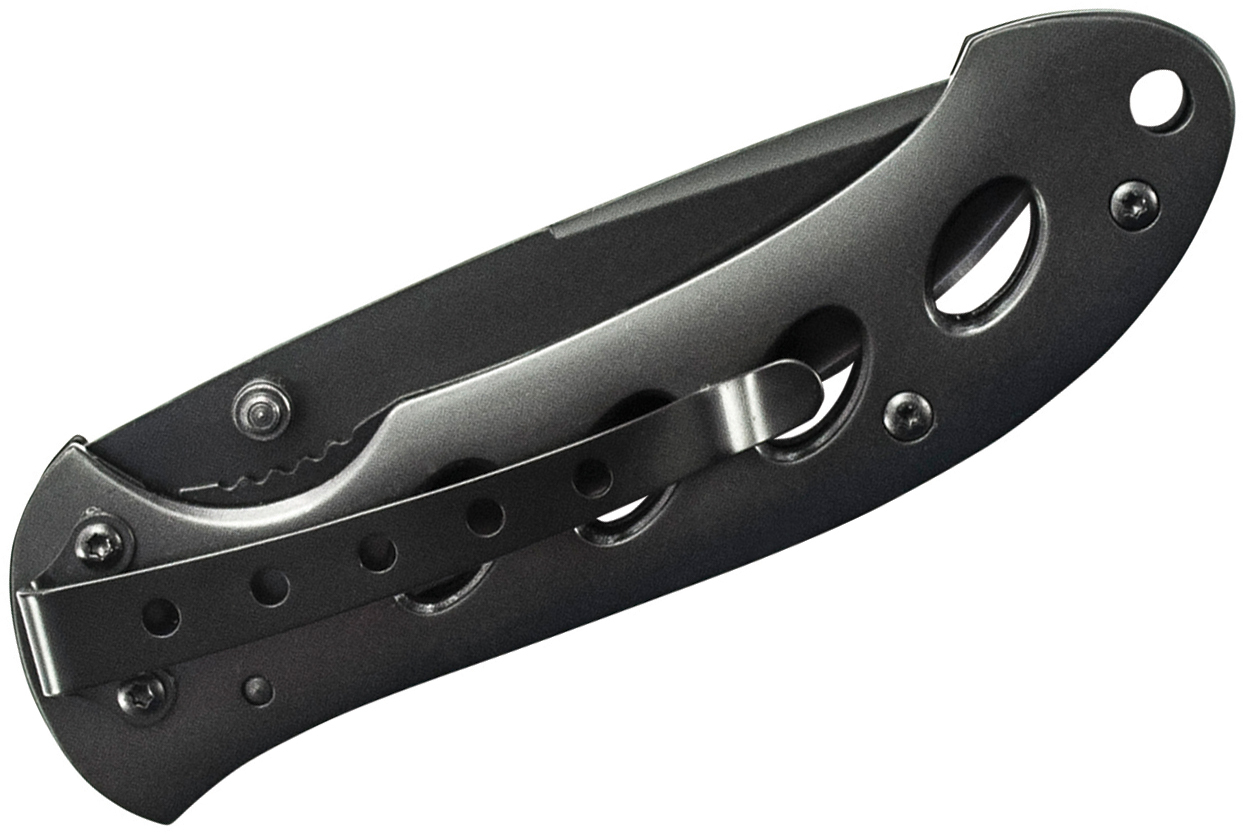 Den fällbara lätta kniven Smith & Wesson All Black Hole in Han med ett svart blad av stål 4032 och ett svart handtag av rostfritt stål med hål för att minska vikten vid användning. Bladet är utrustat med en tumknopp för enklare öppning. Kniven har ett bältesclip för att fästa på bältet.