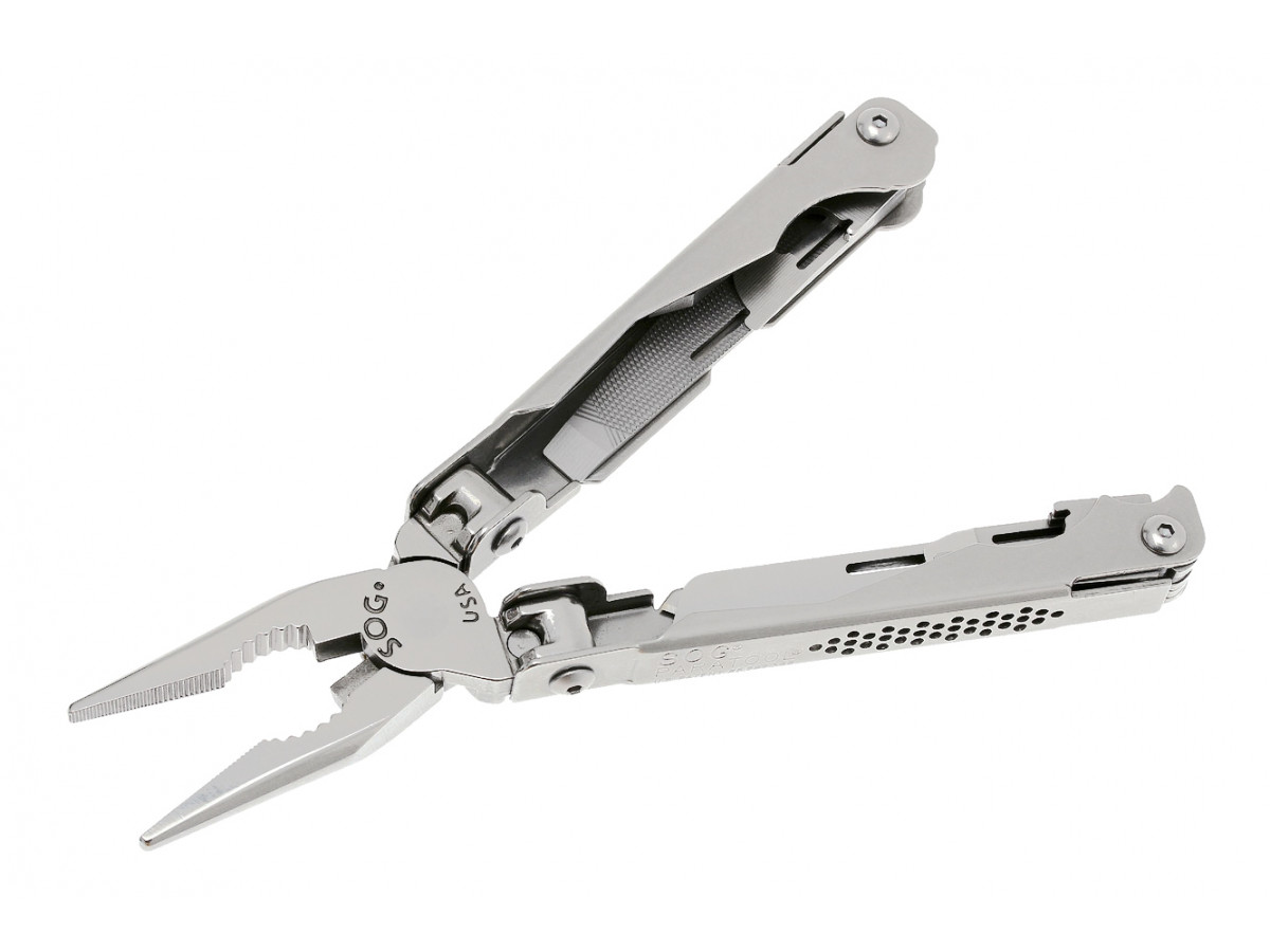 Fungerar som en tång och innehåller fällbara blad och andra verktyg. Det är ett äkta multiverktyg som är användbart i många situationer.