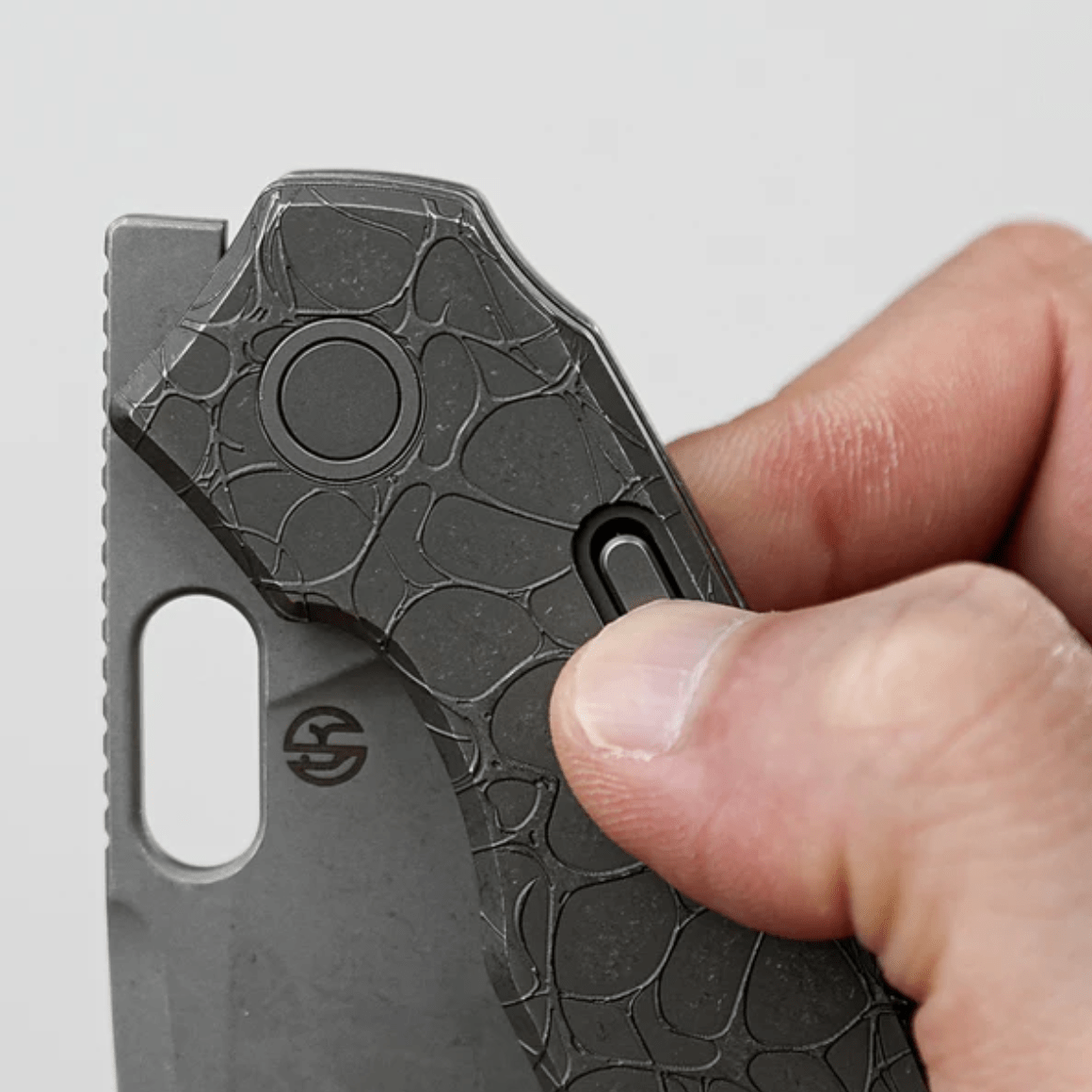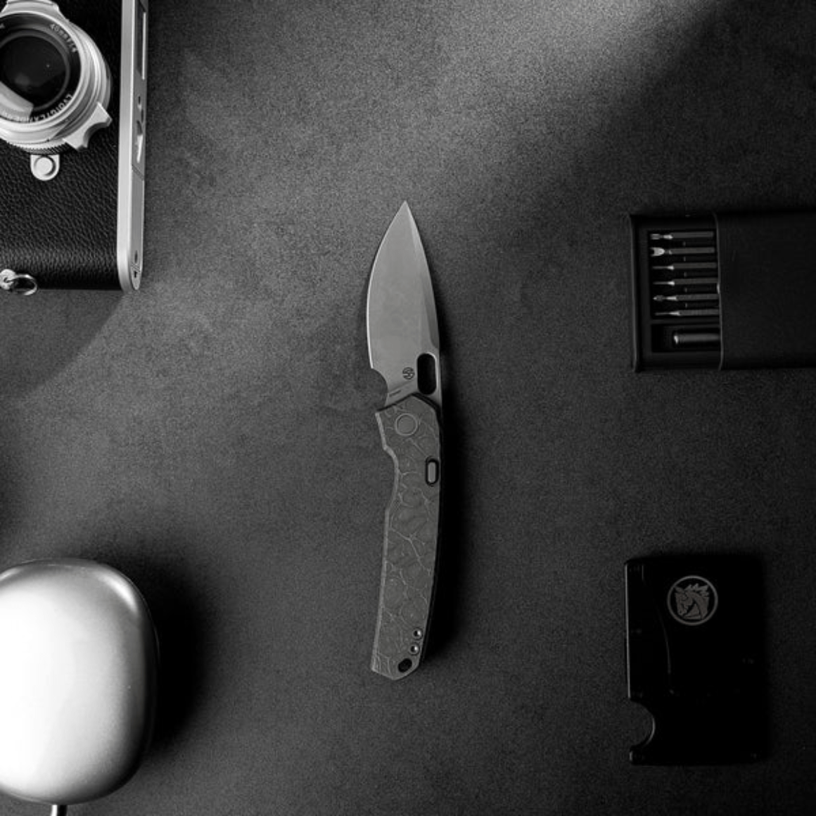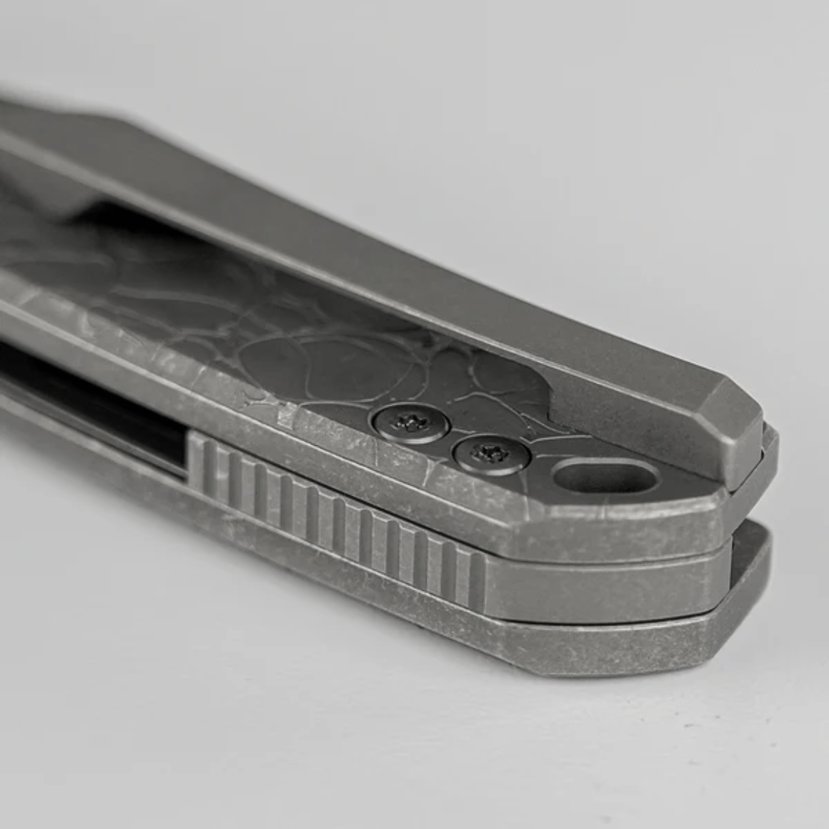 Det dimgrå titaniumhandtaget visar upp en av de mest komplexa behandlingarna hittills: en intrikat kombination av etsning, syratvätt och stonewashing. Denna lagerprocess ger handtaget dess distinkta karaktär—diskret men ändå fängslande, lågmäld men ändå dynamisk.